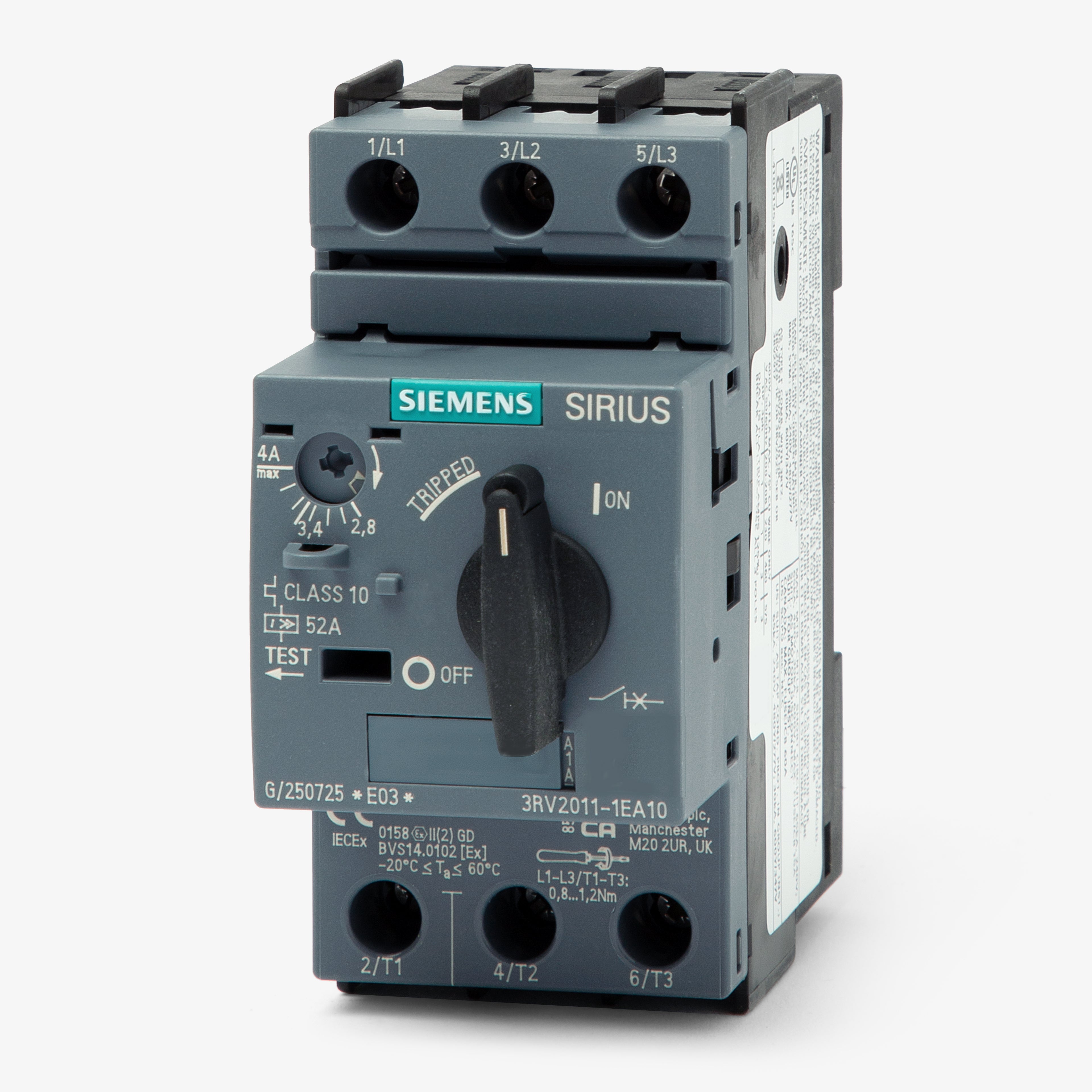 The Siemens 3RV2011-1EA10 is a starter with a current rating of 2.8 to 4 Amps and a voltage rating of 600VAC. The 3RV2011-1EA10 has a screw/snap-on mounting type and it is used for class 10 electrical motor.