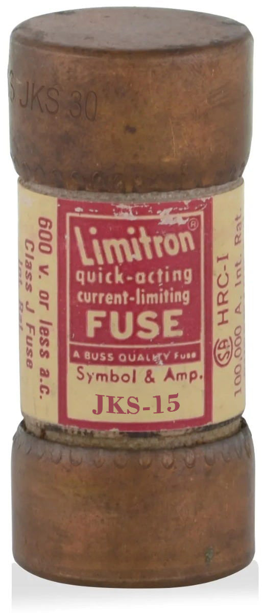 The Eaton JKS-15 is a fuse with a current rating of 15 Amps and a voltage rating of 600VAC. It has an interrupting rating of 200kAIC at 600VAC. The JKS-15 has a ferrule terminal connection type and it is used fr power panelboards, machinery disconnects applications.