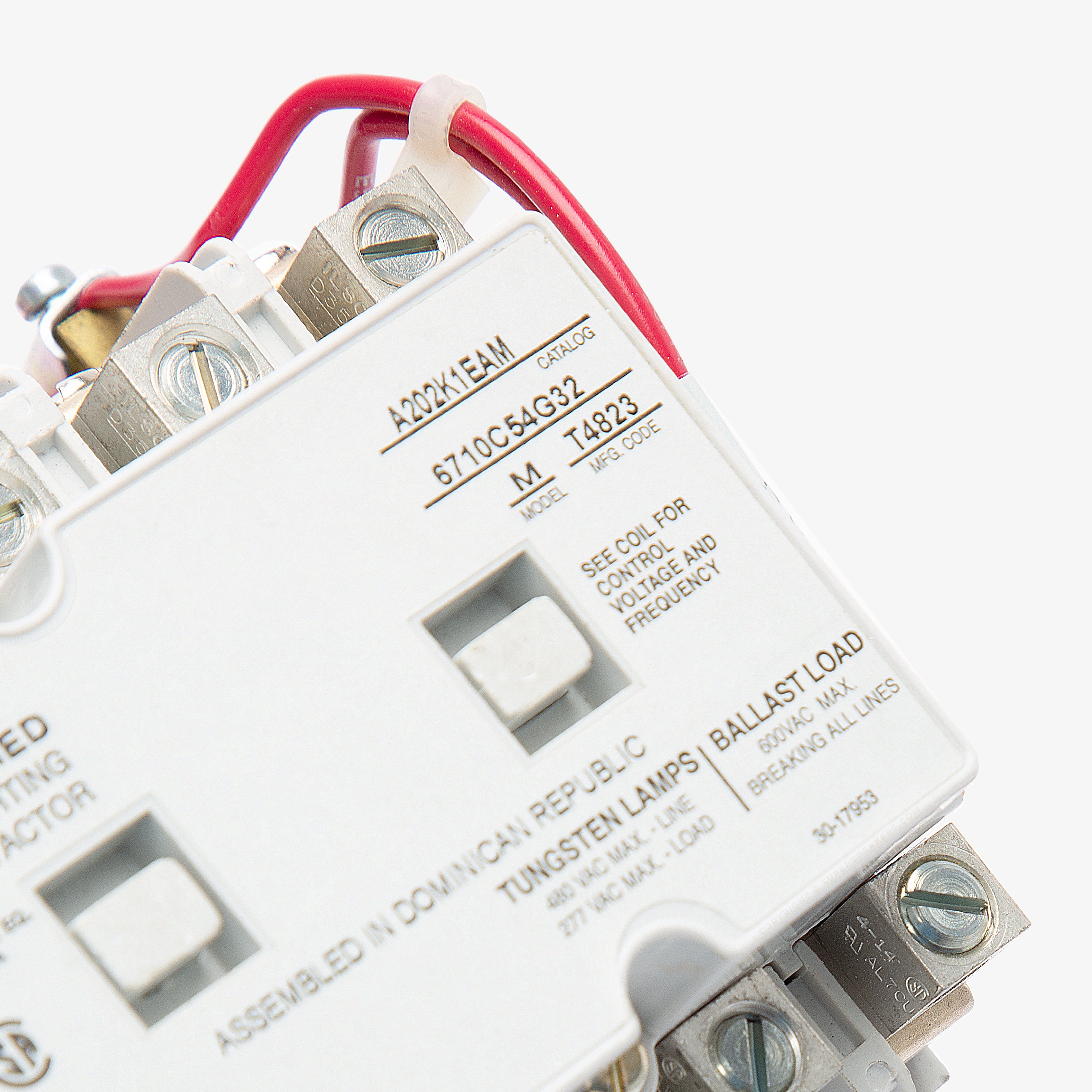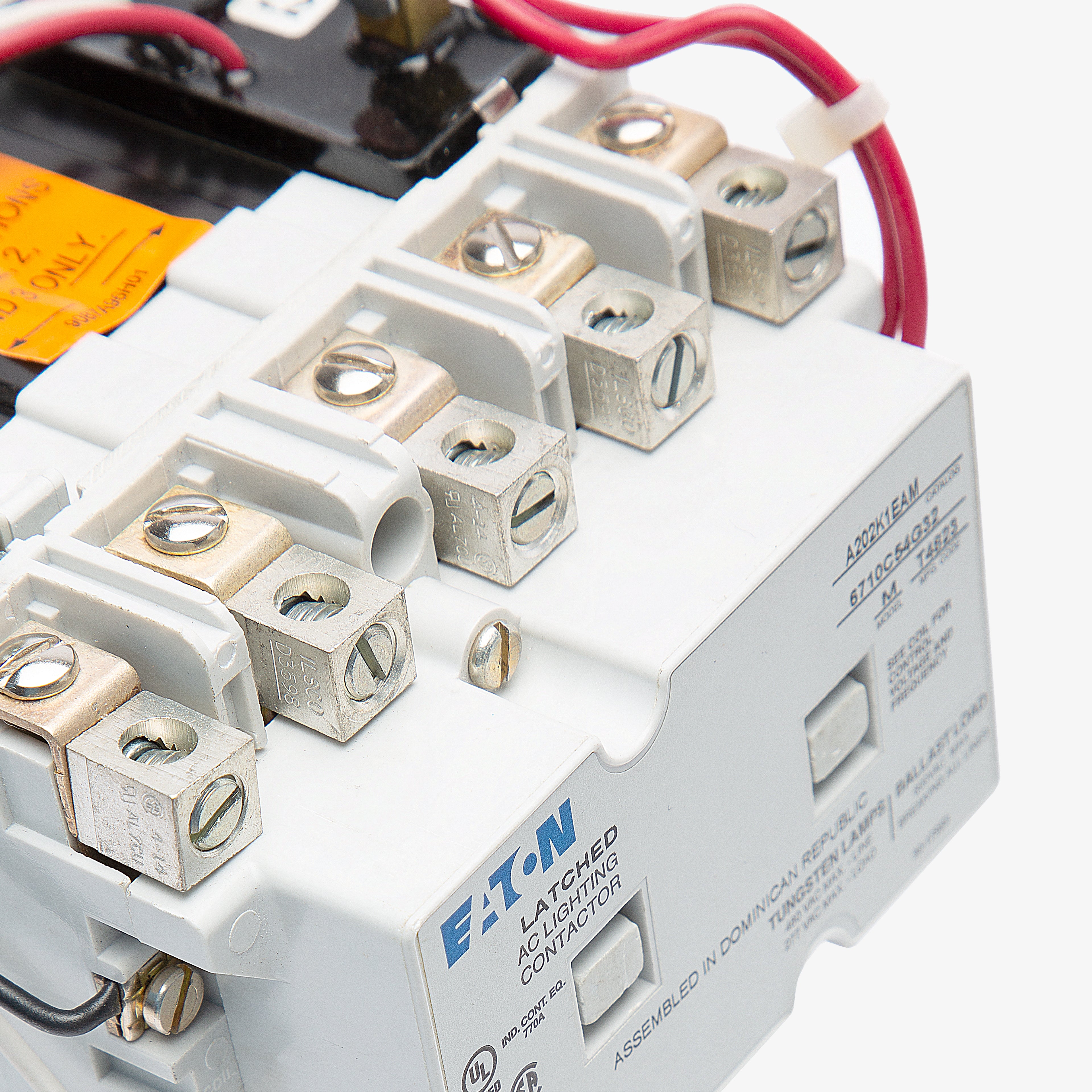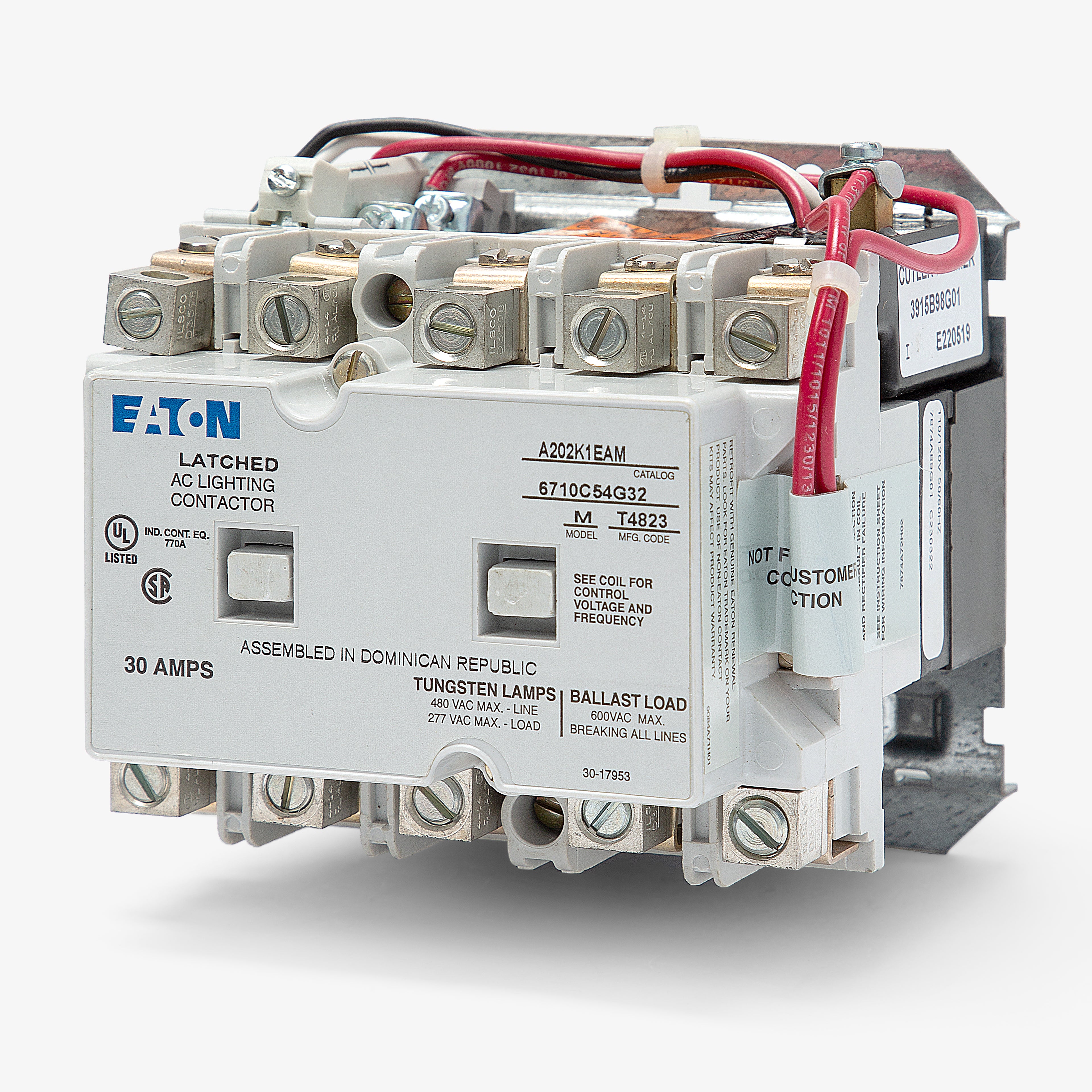 The Eaton A202K1EAM is a 5 Pole contactor with a current rating of 30 Amps and a voltage rating of 600VAC. It has a coil volts of 110/120VAC at 50/60Hz. The A202K1EAM used for A202 magnetically latched motor control systems.