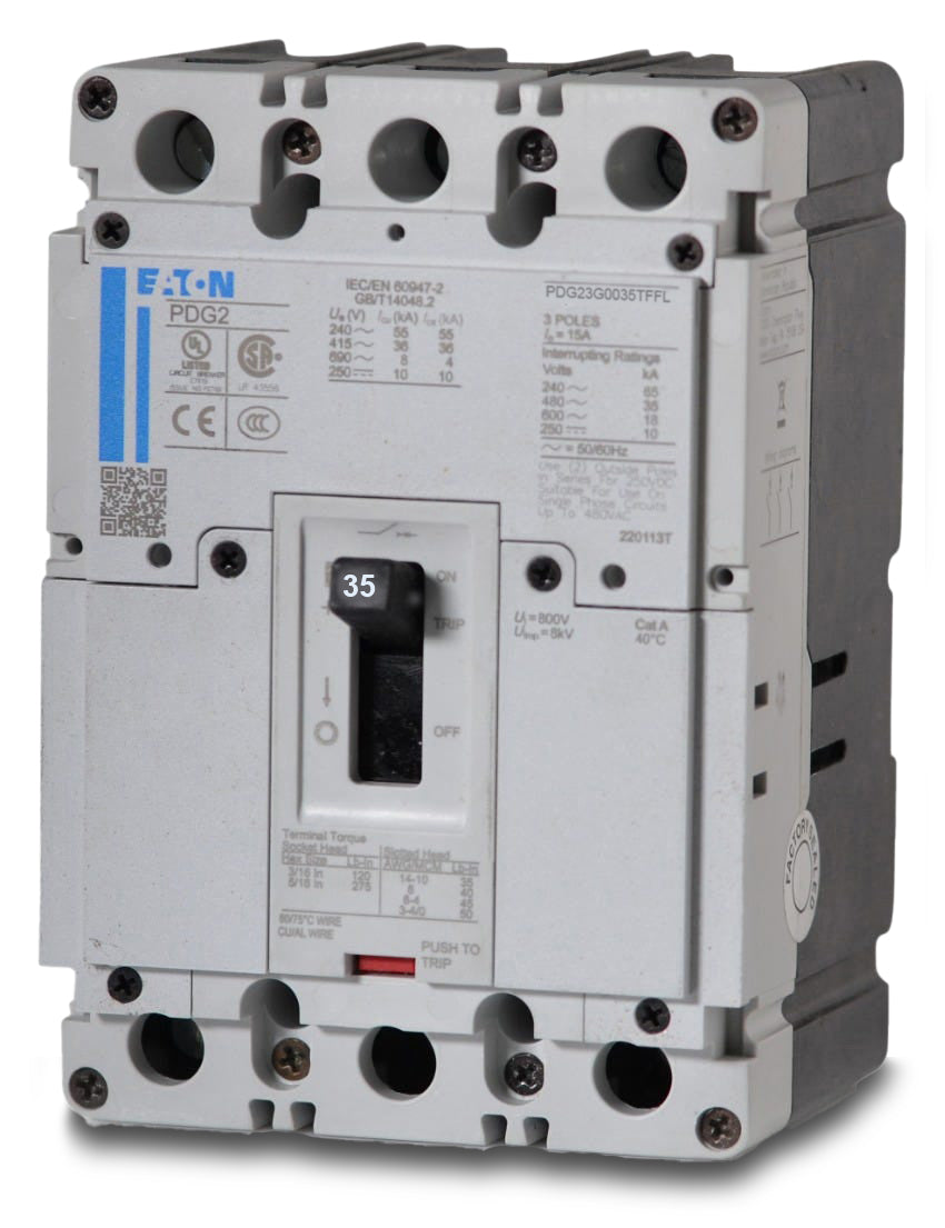 The Eaton PDG23G0035TFFL is a 3 Pole thermal magnetic molded case circuit breaker with a current rating of 35 Amps and a voltage rating of 600VAC, 250VDC. It has an interrupting rating of 35kAIC at 480VAC. The PDG23G0035TFFL has a bolt-on connection type and includes long time and instantaneous trip functions.