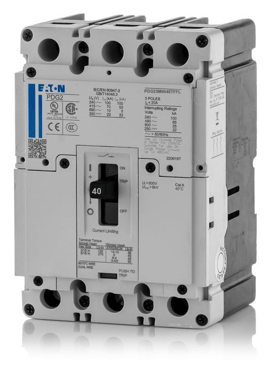 The Eaton PDG23M0040TFFL is a 3 Pole thermal magnetic molded case circuit breaker with a current rating of 40 Amps and a voltage rating of 600VAC. It has an interrupting rating of 65kAIC at 480VAC. The PDG23M0040TFFL has a bolt-on connection type and includes long time and instantaneous trip functions.