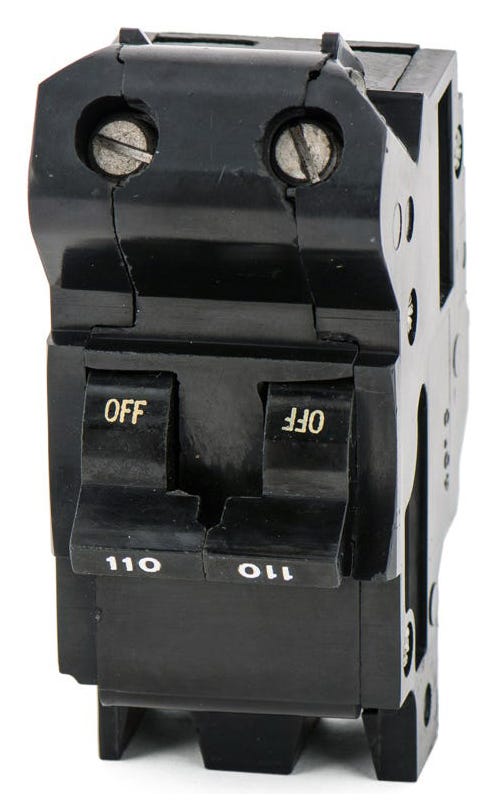 The Federal Pacific NB110 is a 2 Pole thermal magnetic molded case circuit breaker with a current rating of 110 Amps and a voltage rating of 240V. It has an interrupting rating of 10kAIC at 240V. The NB110 has a bolt-on connection type and includes long time and instantaneous trip functions.