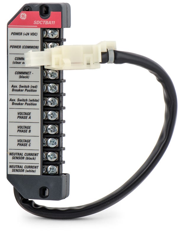 General Electric SDCT spectra series power break II distribution cable terminal block with maximum voltage rating of 600Vac 125-250Vdc modular attachment primarily used to provide an alternate means of input to spectra RMS molded case circuit breakers with Microversatrip Plus or Microversatrip PM trip units Allows point-to-point wiring of breakers instead of using the distribution cable system.