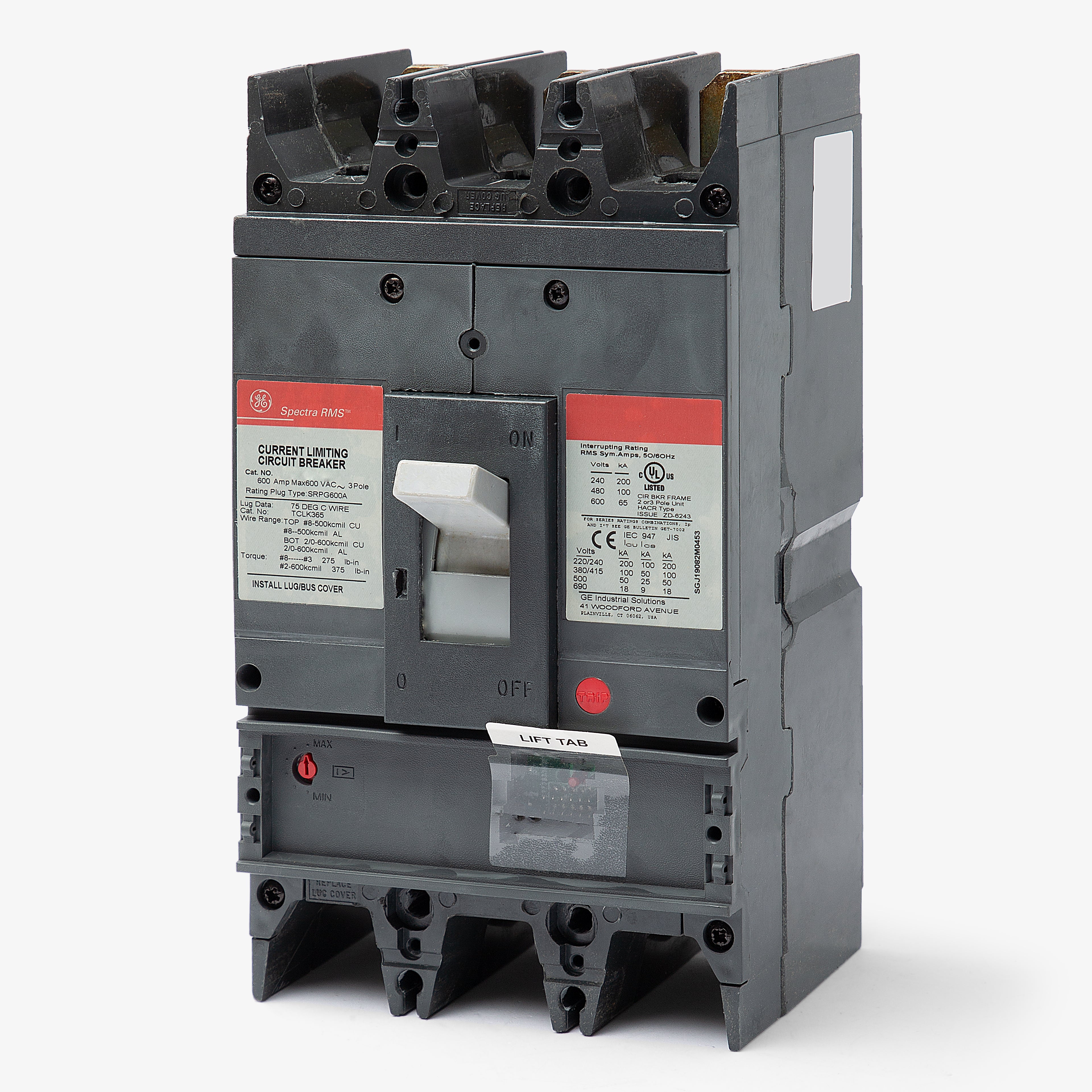 The General Electric SGPA36AT0400 is a 3 Pole solid state molded case circuit breaker with a current rating of 400 Amps and a voltage rating of 600V. It has an interrupting rating of 100kA@480V. The SGPA36AT0400 has a bolt-on connection type and includes LSI - long-time, short-time and instantaneous trip functions. RATING PLUG AND LUGS SOLD SEPARATELY.