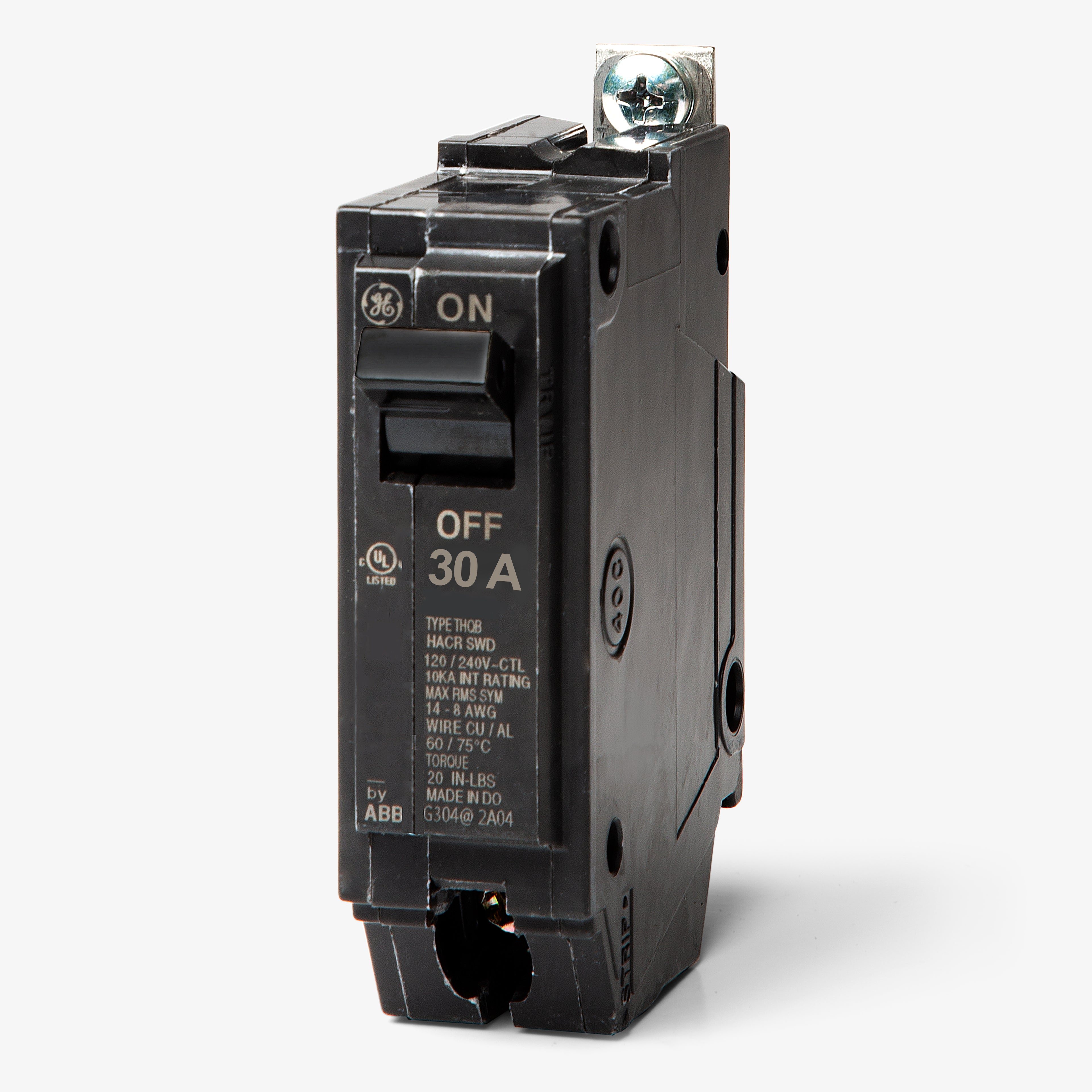 The General Electric THHQB1130 is a 1 Pole thermal magnetic molded case circuit breaker with a current rating of 20 Amps and a voltage rating of 120/240VAC. It has an interrupting rating of 22kAIC at 120/240VAC. The THHQB1130 has a bolt-on connection type and includes long time and instantaneous trip functions.