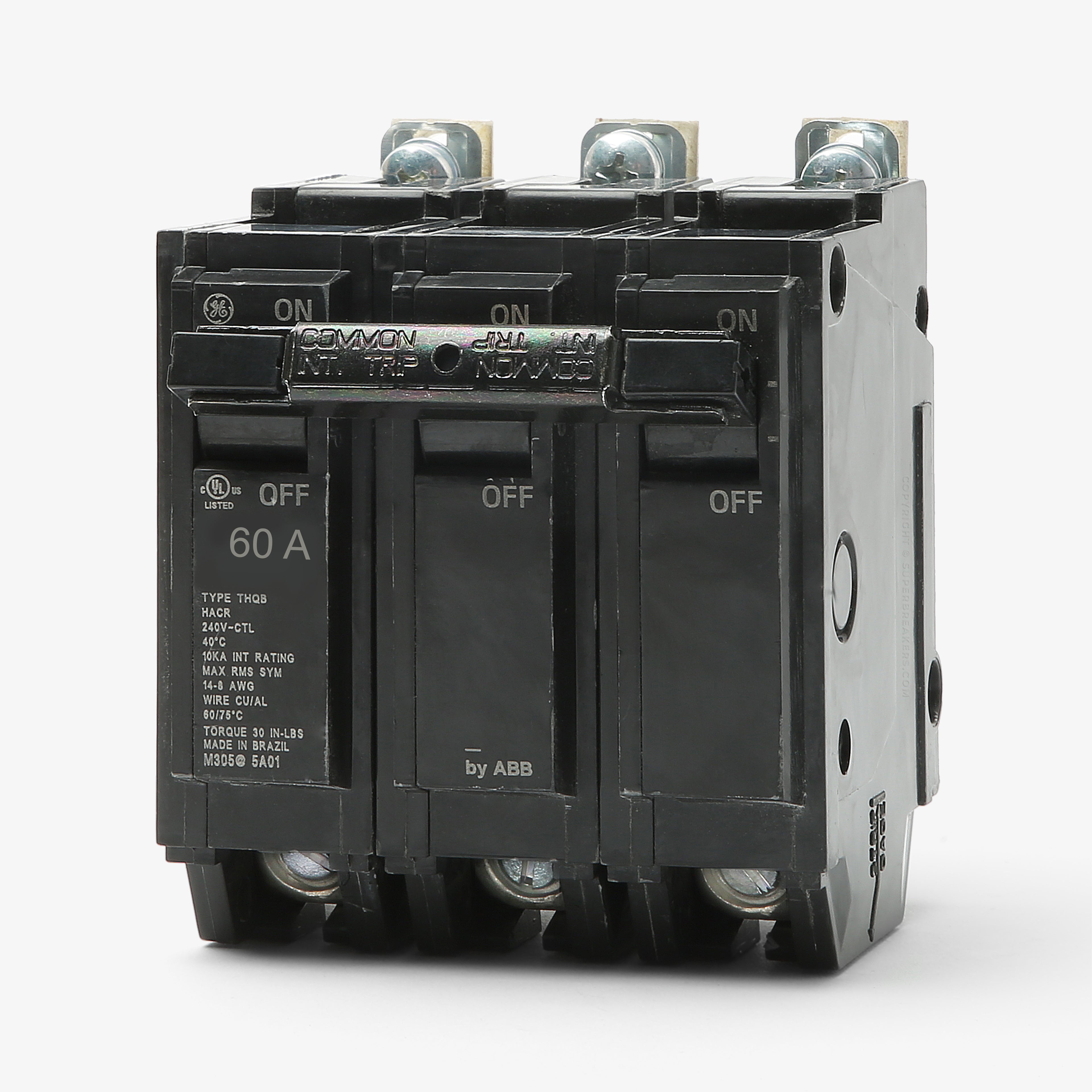 Part of the Q-Line family, this 60-amp, 3-pole miniature circuit breaker delivers dependable thermal-magnetic protection for commercial and industrial electrical systems. It features a quick-make, quick-break mechanism to ensure reliable operation under fault conditions. The unit bolts securely into GE A-Series panelboards and AQ lighting panels. Rated for 10kAIC at 240VAC, this HACR-rated breaker includes an internal common trip and box lug terminals for 8-3 AWG copper or aluminum wire.