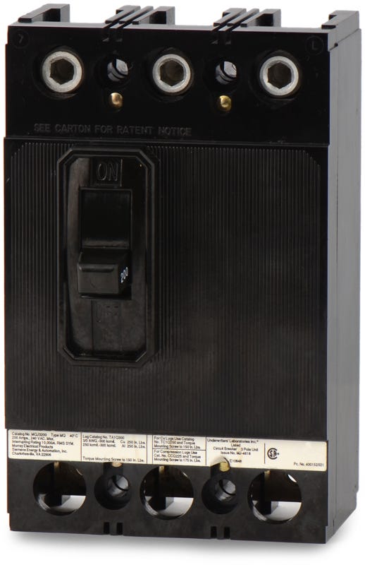 The Murray MQJ3200 is a 3 Pole thermal magnetic molded case circuit breaker with a current rating of 200 Amps and a voltage rating of 120/240VAC. It has an interrupting rating of 10kAIC at 240V. The MQJ3200 has a bolt-on connection type and includes long time and instantaneous trip functions.