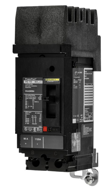 Manufacturer: Square D/Schneider Electric Cat. No: HGA260904 Alternate Part No: HGA260904 Product Type: Circuit Breaker Trip Unit Type: Thermal Magnetic Frame Type: H Frame Size: 150A/HG Frame: G Series: HG Type: HGA Phase: 1 Pole: 2 Voltage Rating: 600 V Amperage Rating: 90 A Connection: I-Line Style Plug-In Functions: Long Time and Instantaneous Interrupt Rating: 20 kA 500 V DC, 65 kA 240 V AC, 35 kA 480 V AC, 18 kA 600 V AC, 20 kA 250 V DC Size: 9.73 Inch H x 2.94 Inch W x 4.8 Inch D Wire Gauge: AWG 14, AWG 3/0 Aluminium/Copper Min. Wire Size: 14 AWG Max. Wire Size: 3 AWG Terminal Connection: Lug For Use With: I Line Panelboards Application: Reverse Fed Applications Ambient Air Temperature For Operation: 104 °F (40 °C) Electrical Connection: I-Line Connection Line, Lugs Load Mounting Mode: I-Line Approval: CSA, CE, UL, IEC Brand: Powerpact H[R] Authentic Square D/Schneider Electric Product