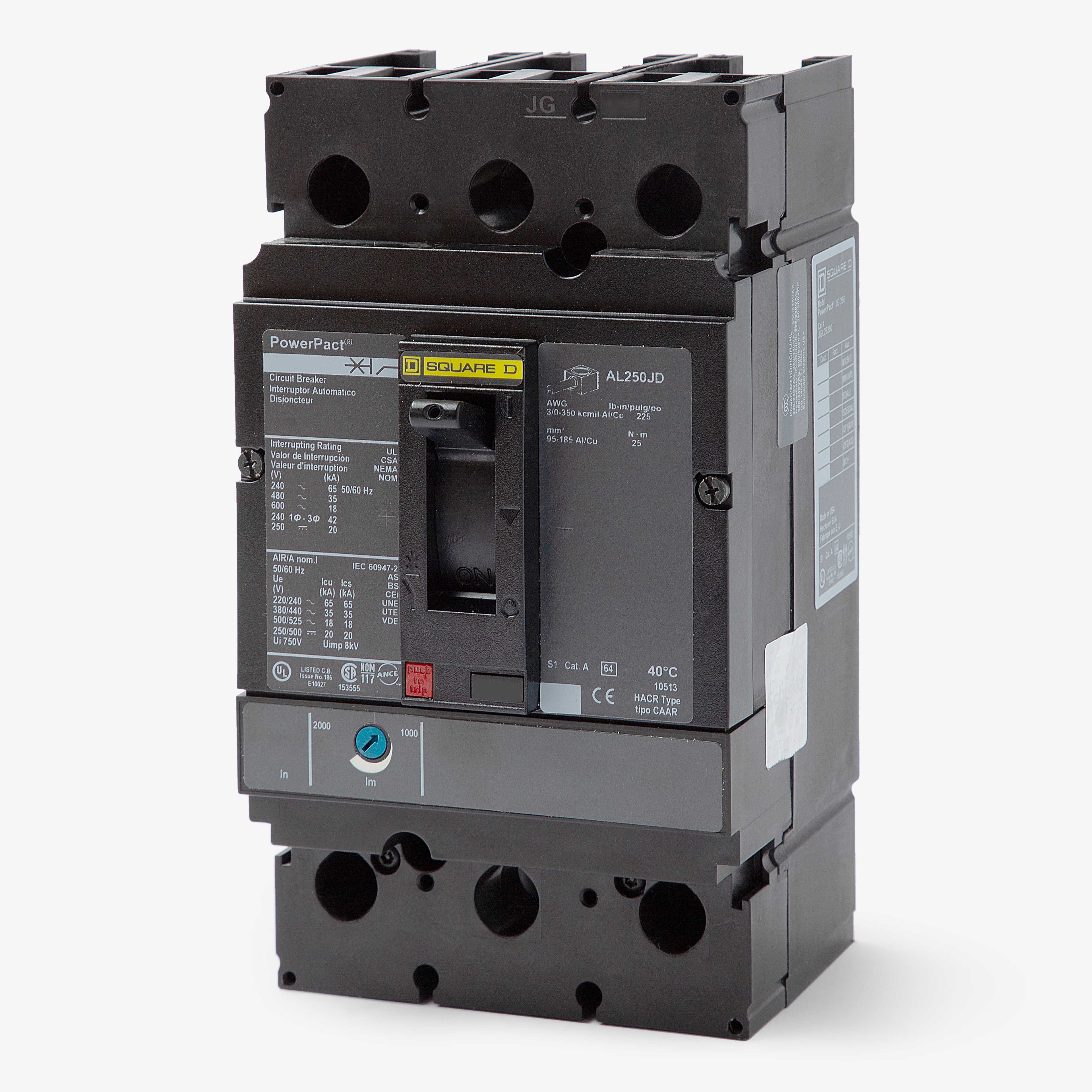 Delivering 200A of continuous current, the Square D JGL26200 is a 2-pole PowerPacT J-Frame molded case circuit breaker. It is built for commercial and industrial power distribution. The unit mount design fits seamlessly into Square D NF panelboards, switchboards, and industrial enclosures, utilizing AL250JD lugs for 3/0 AWG to 350 kcmil wire. It features a thermal-magnetic trip unit with adjustable magnetic settings and provides 65kA interrupting capacity at 240VAC alongside a Visi-Trip flag.