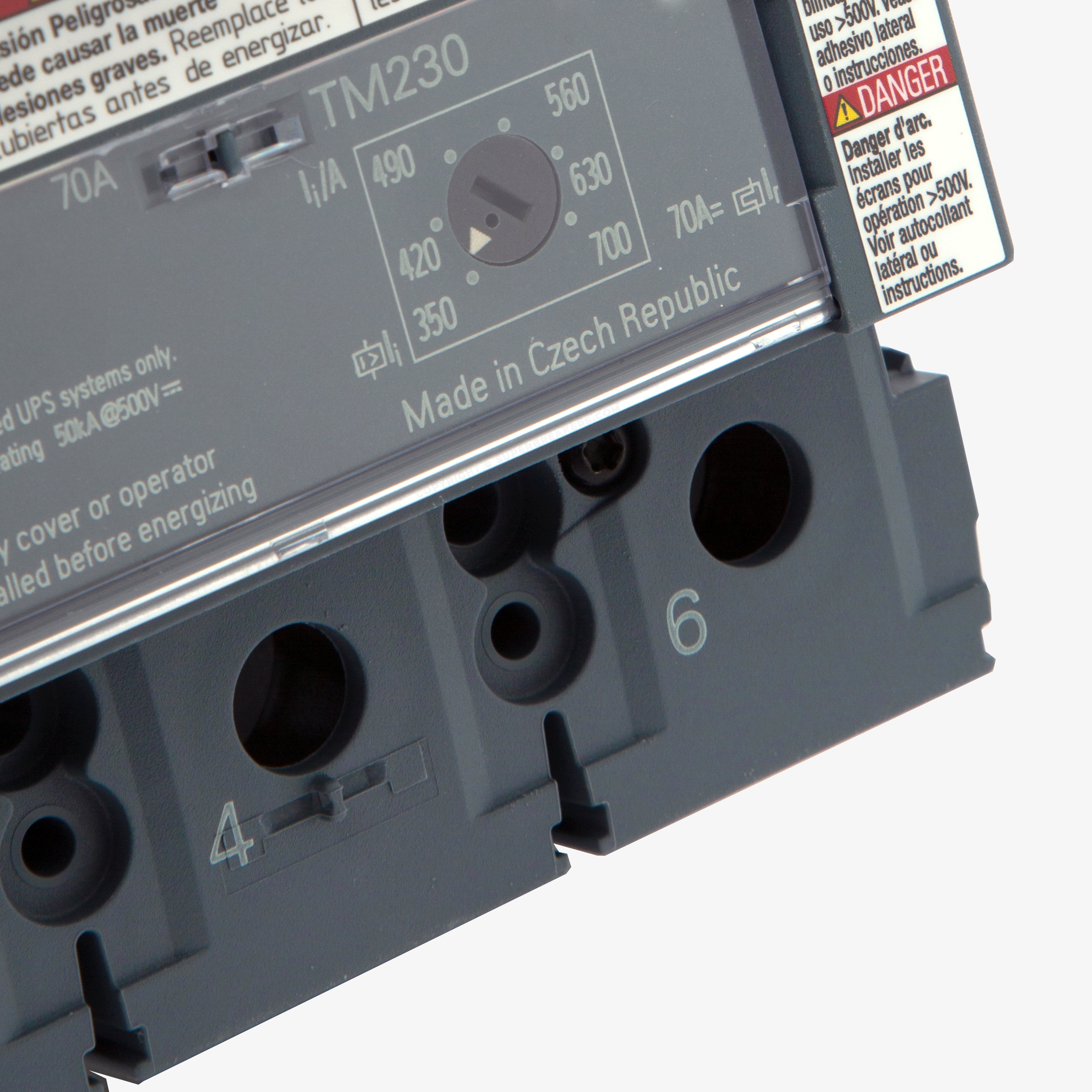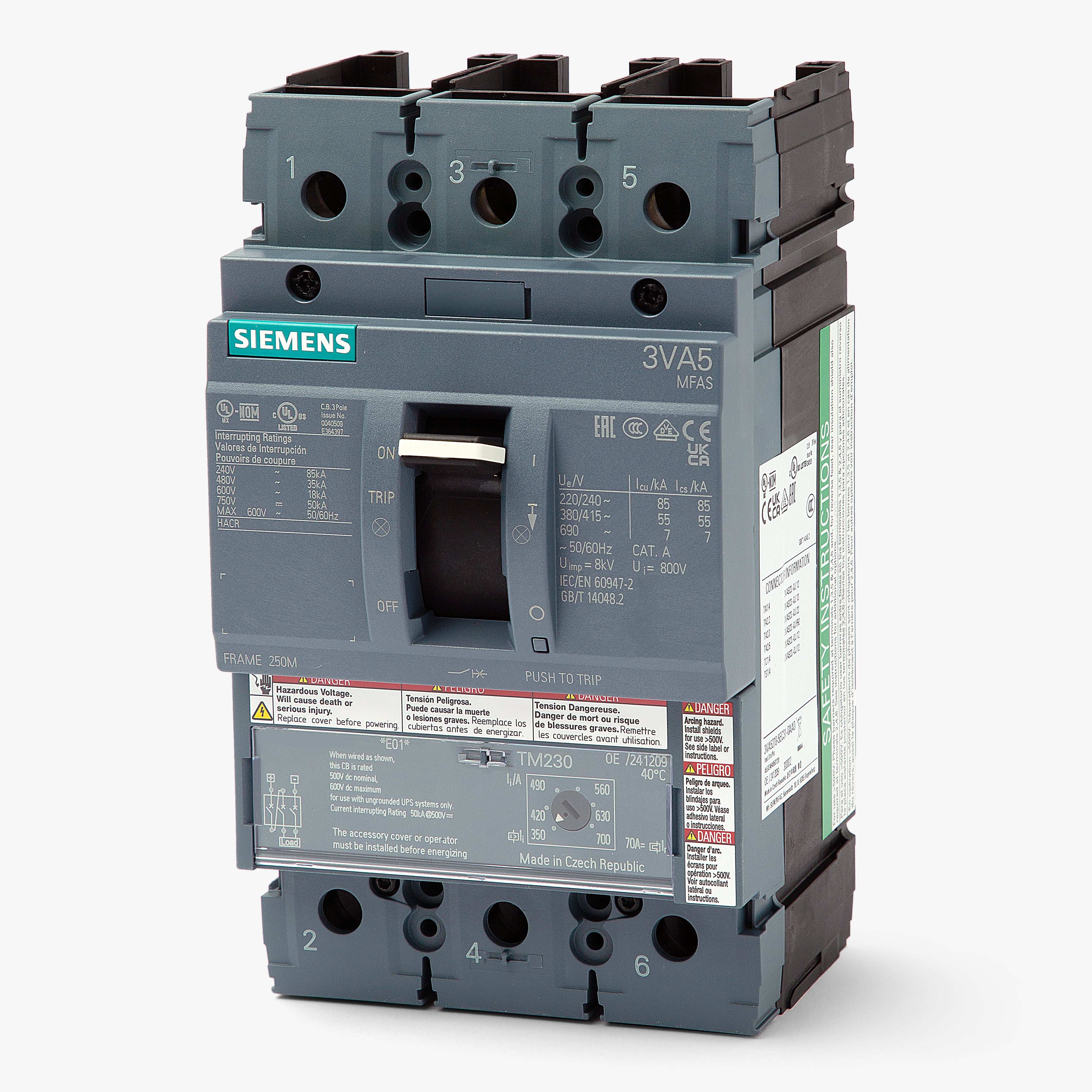 The Siemens 3VA5225-5EC31-0AA0 is a 3 Pole thermal magnetic molded case circuit breaker with a current rating of 250 Amps and a voltage rating of 600V. It has an interrupting rating of 18kAIC at 600V, 35kAIC at 480V. The 3VA5225-5EC31-0AA0 has a feed-thru connection type and includes long time and instantaneous trip functions.