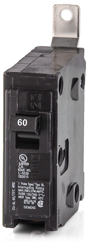 The Siemens B160 is a 1 Pole thermal magnetic molded case circuit breaker with a current rating of 60 Amps and a voltage rating of 120/240VAC. It has an interrupting rating of 10kAIC at 240V. The B160 has a bolt-on connection type and includes long time and instantaneous trip functions.