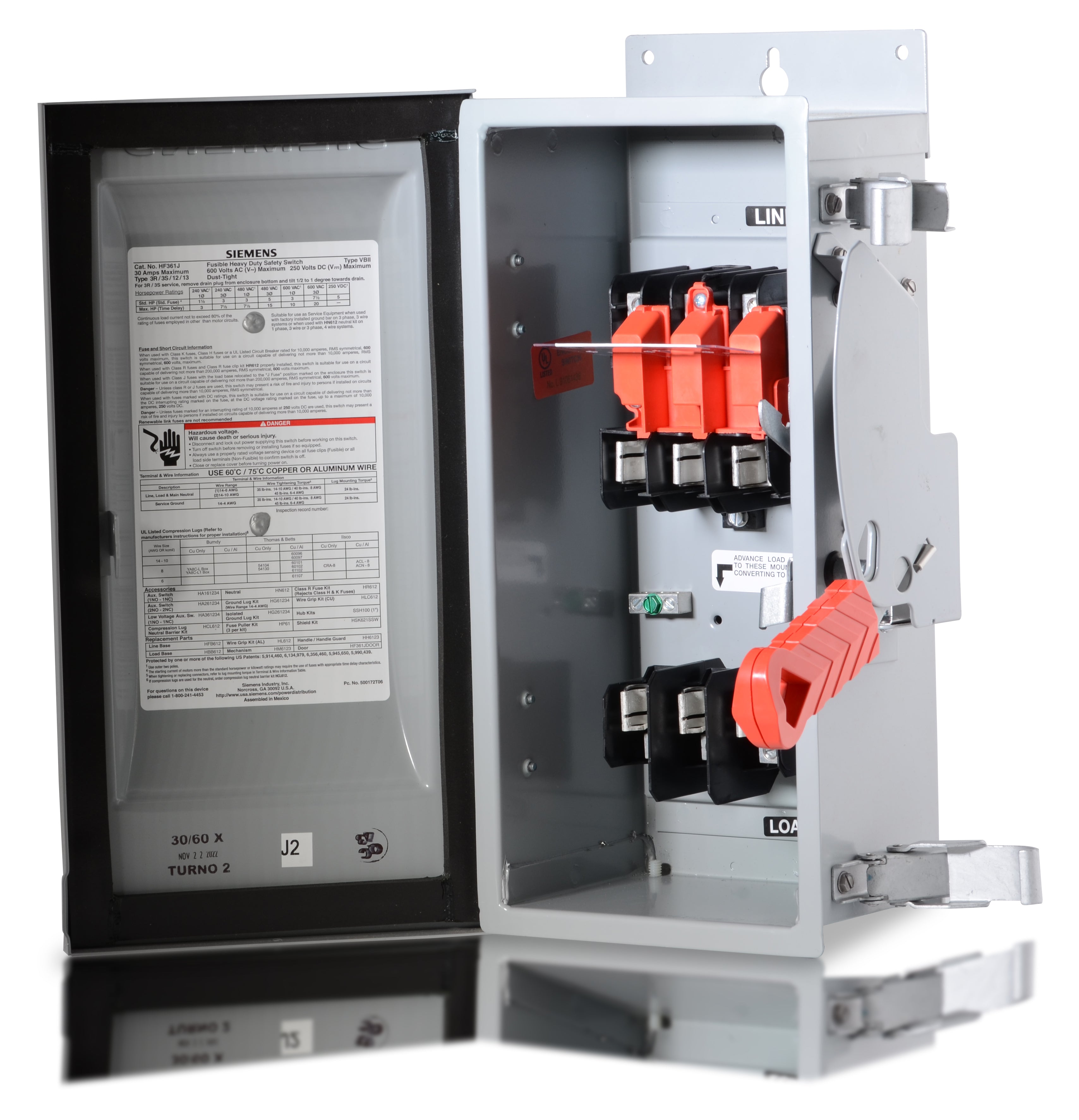 The Siemens HF361J is a 3 Pole safety switch with a current rating of 30 Amps and a voltage rating of 600VAC, 250VDC. It has an interrupting rating of 200kA@600V. The HF361J has a surface mounting type and it is used for residential, commercial, industrial applications.
