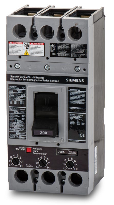 Siemens HHFXD sentron series three pole 200 ampere bolt-on molded case circuit breaker with maximum voltage rating of 600V tripping method thermal magnetic common trip and high interrupting rating of 100 kiloampere at 480V complete with non-interchangeable trip unit and load side lug terminals.