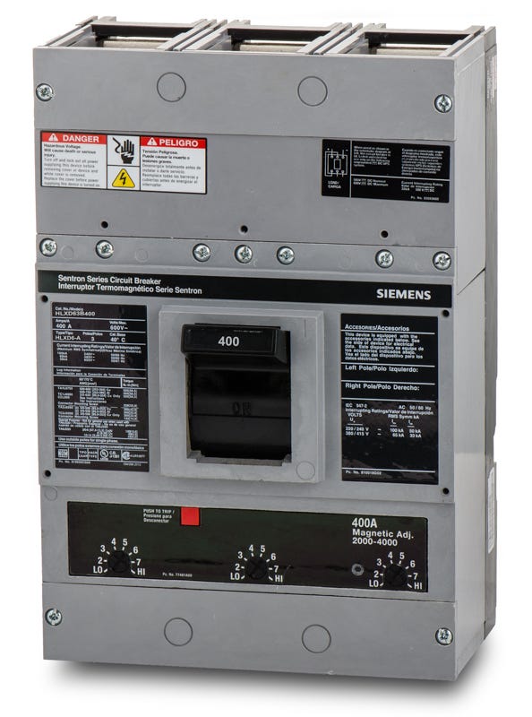 Siemens HLXD sentron series three pole 400 ampere bolt-on molded case circuit breaker with maximum voltage rating of 600V tripping method thermal magnetic and standard interrupting rating of 65 kiloampere at 480V complete with non-interchangeable trip (LI) long-time and instantaneous trip functions and load side lug terminals.