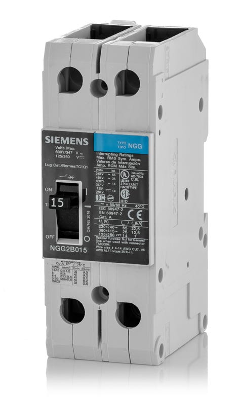 Siemens 2 Pole Circuit Breaker features a thermal magnetic molded case for extra protection. The circuit breaker has a current rating of 15 amps with a voltage rating of 600 v. It has an interrupt rating of 25kA@480V.