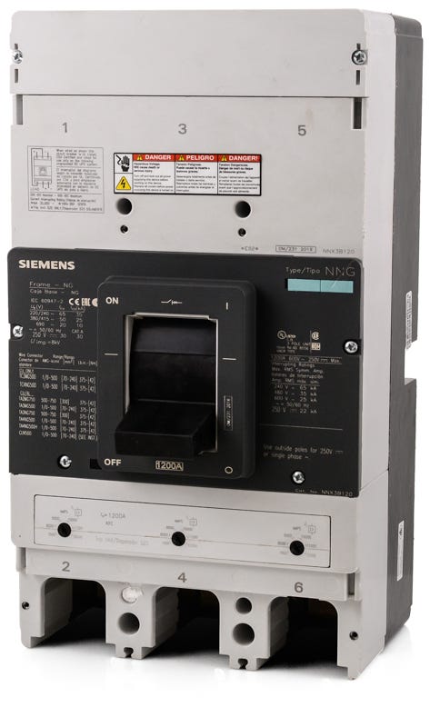 Siemens NMX Bolt-On 3 Poles 3 Phase Circuit Breaker comes with a current rating of 1200A and a voltage rating of 600V. It has a standard interrupting capacity with Thermal Magnetic Protection and (LI) Long-Time and Instantaneous trip functions. This breaker is UL Listed and IEC Rated.