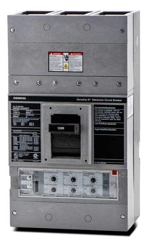 Siemens SND Sentron series three pole 1000 ampere bolt-on solid state molded case circuit breaker with maximum voltage rating of 600V and standard interrupting rating of 35 kiloampere at 480V complete with (LSIG) long-time short-time Instantaneous and ground fault trip functions acceptable for reverse connection application.
