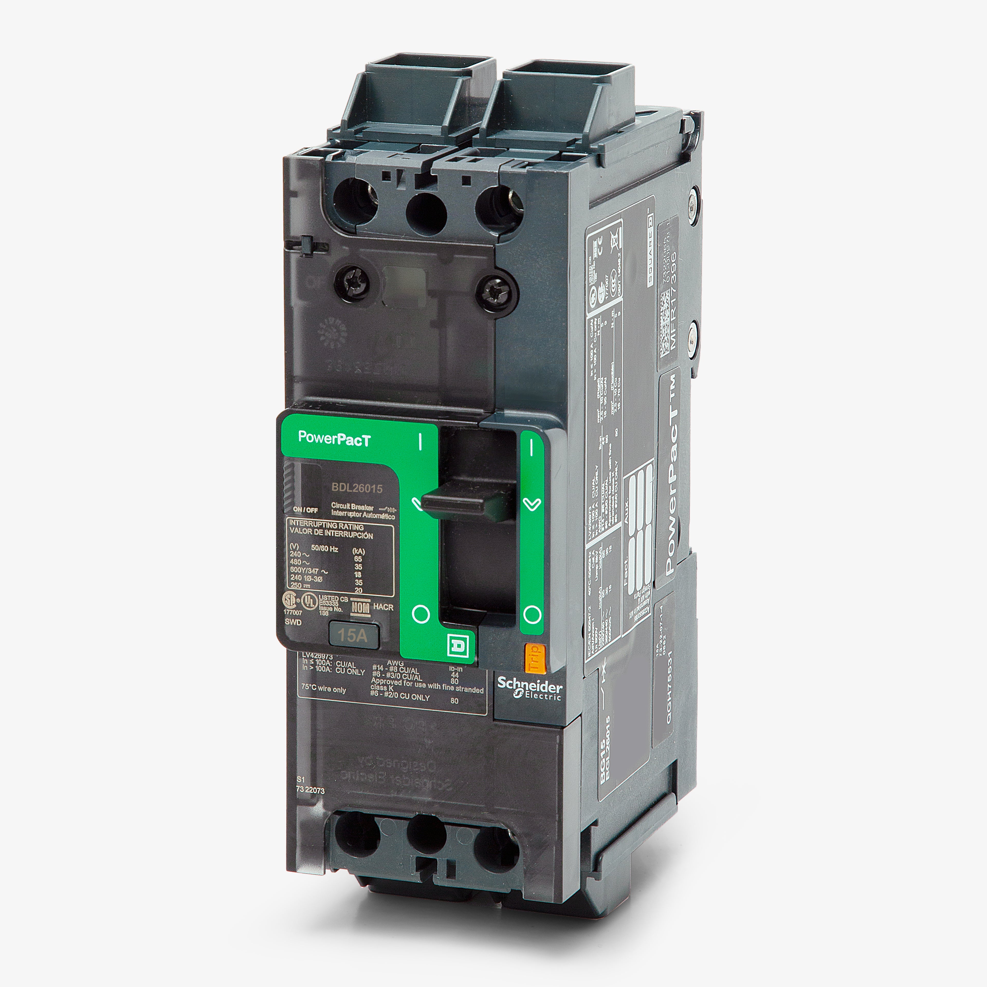 The Square D BDL26015 is a 2 Pole thermal magnetic molded case circuit breaker with a current rating of 15 Amps and a voltage rating of 600V. It has an interrupting rating of 18kAIC at 480V. The BDL26015 has a unit mounting type and includes long time and instantaneous trip functions.