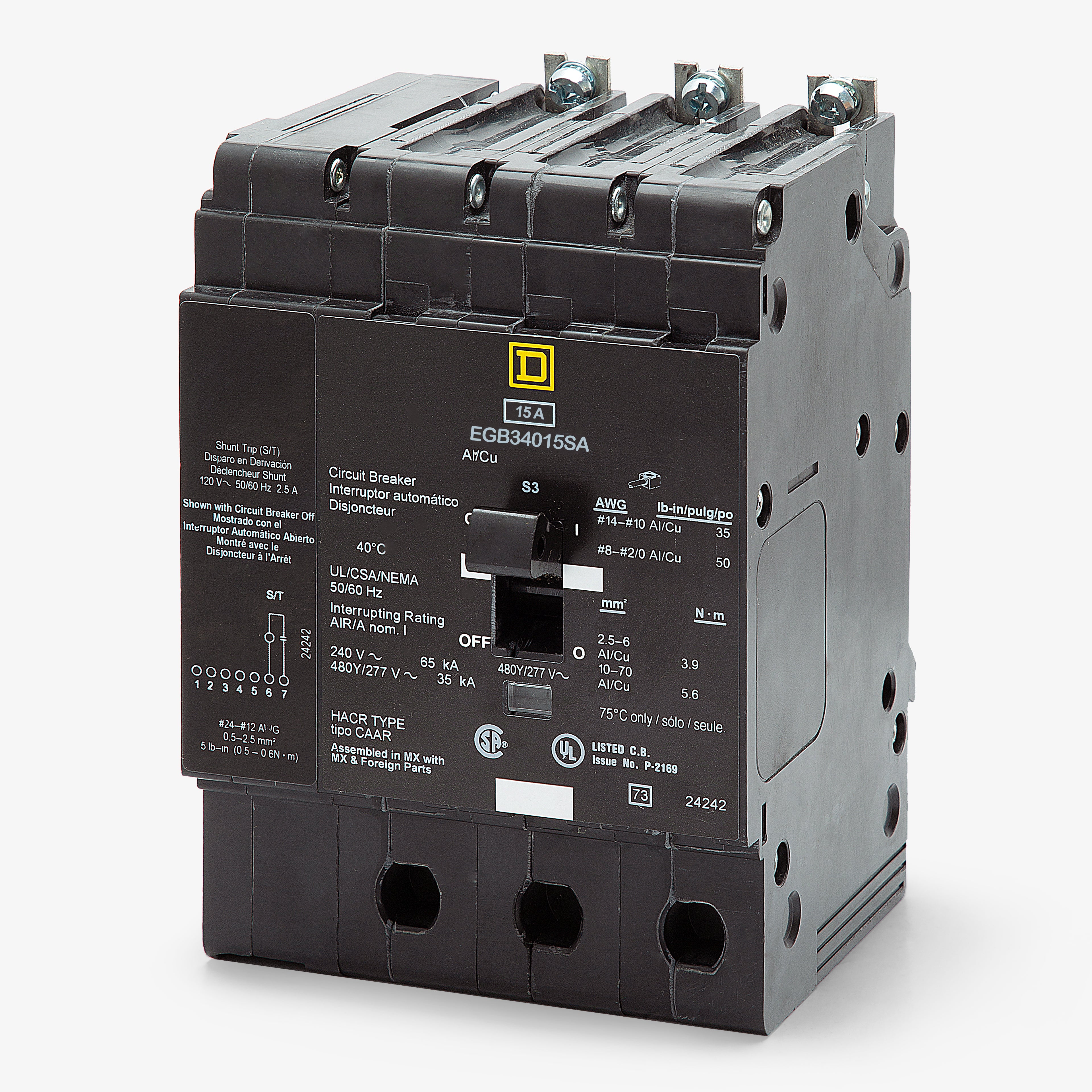 The Square D EGB34015SA is a 3 Pole thermal magnetic molded case circuit breaker with a current rating of 15 Amps and a voltage rating of 480Y/277VAC. It has an interrupting rating of 35kAIC at 480Y/277VAC. The EGB34015SA has a bolt-on connection type and includes LI - long-time and instantaneous trip functions.