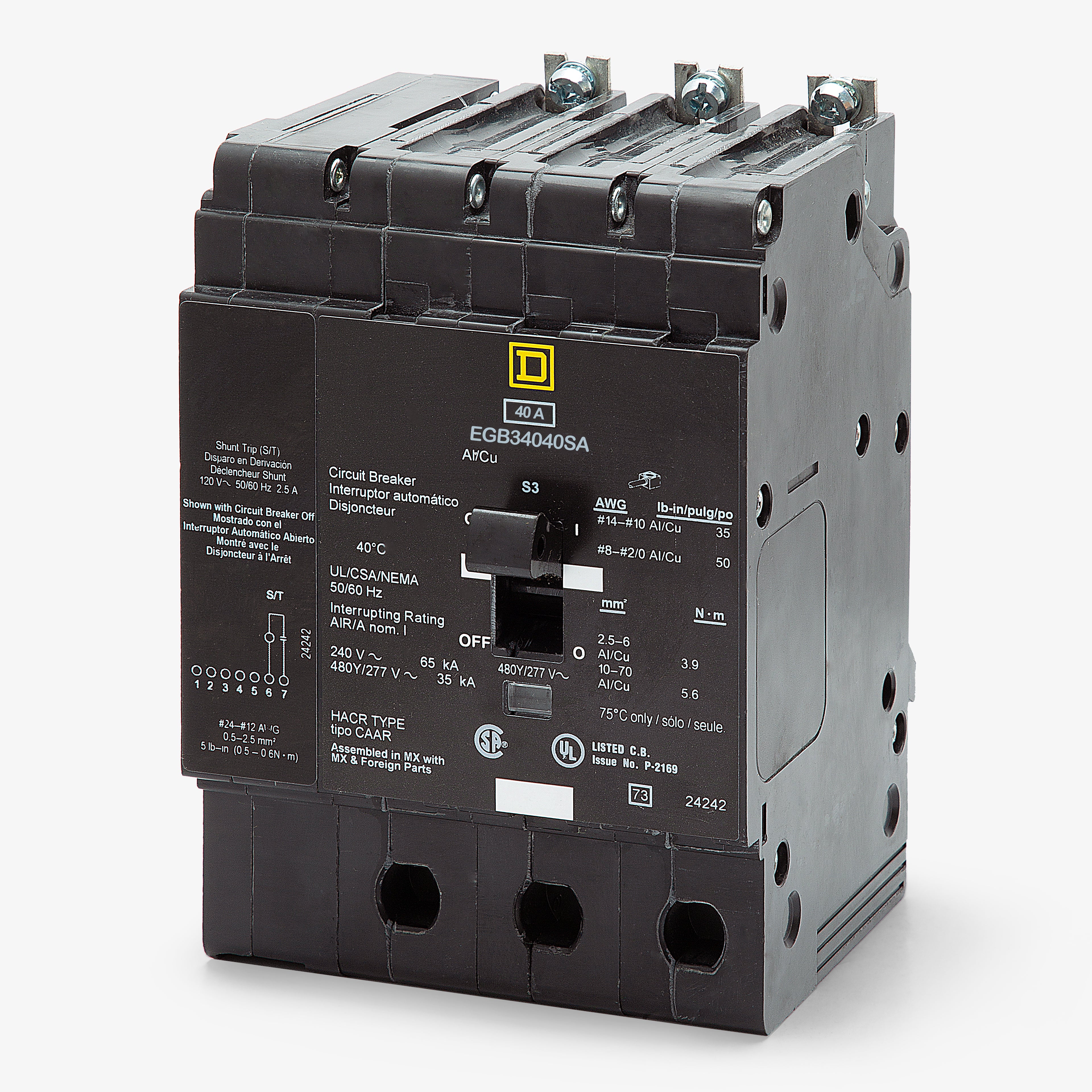 Designed for advanced control, the Square D EGB34040SA is a 3-pole, 40A miniature circuit breaker. It includes a factory-installed 120VAC shunt trip for remote tripping via external signals. This E-frame breaker bolts into Square D NF panelboards. It functions as a substitute for the EJB34040SA, making it ideal for facility upgrades. Delivering 35kAIC at 480Y/277V, it features a Visi-Trip indicator for rapid fault detection and is HACR rated for HVAC equipment.