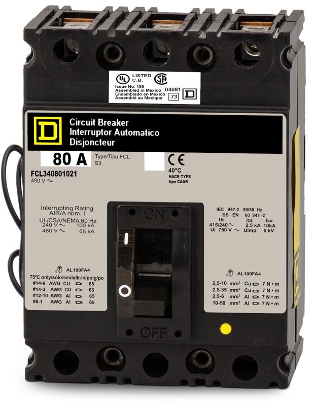 Square D FCL series three pole 80 ampere feed-thru molded case circuit breaker with maximum voltage rating of 480V tripping method thermal magnetic and standard interrupting rating of 65 kiloampere at 480V complete with 120/240V shunt trip (LI) long-time and instantaneous trip functions and line & load side lug terminals.