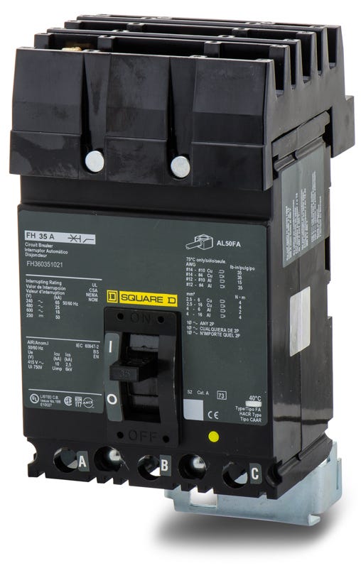 Square D three pole and three phase 35 Ampere F frame type standard interrupting circuit breaker compact easy to install built in features like thermal magnectic i-line style plug-in (LI) Long-Time and Instantaneous trip functions and interrupting rating of 25 kiloampere at 480V.