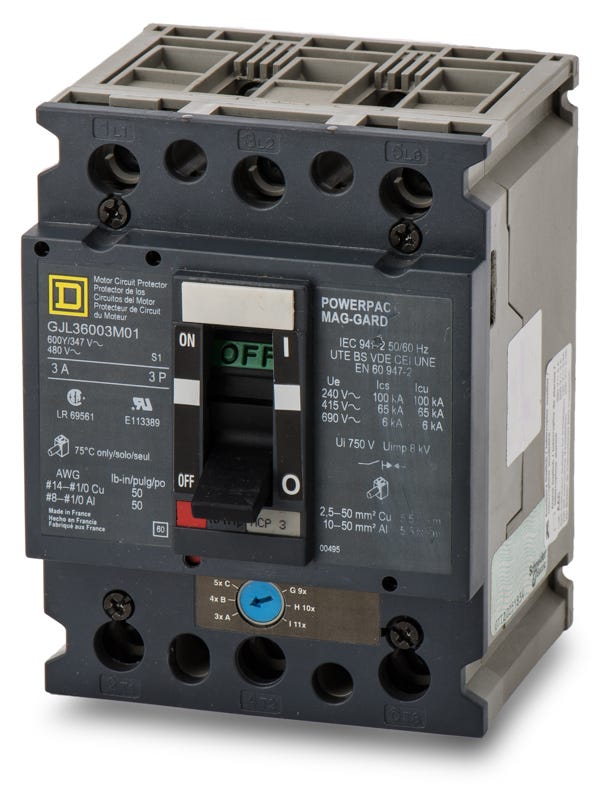Square D GJL series three pole 3 ampere feed-thru molded case circuit breaker with maximum voltage rating of 600V trip type magnetic only trip range 9-33 ampere complete with (I) Instantaneous protection only and line & load side lug terminals.