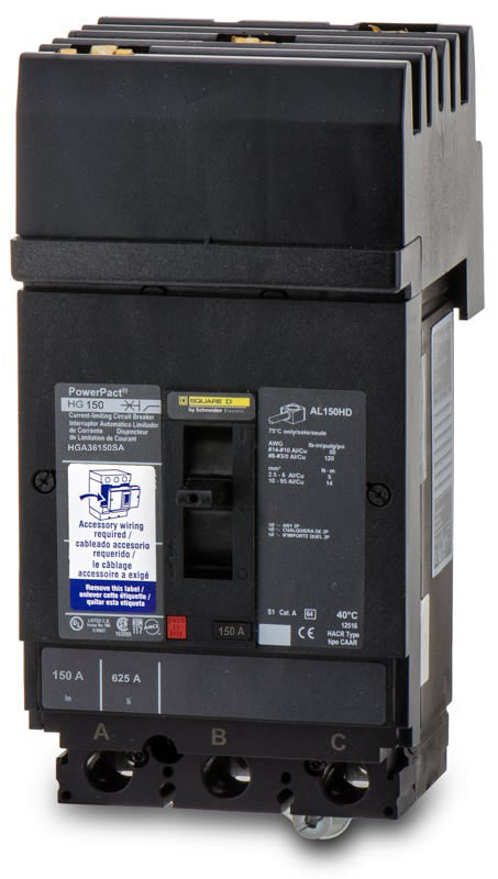 The Square D HGA36150SA is a 3 Pole thermal magnetic molded case circuit breaker with a current rating of 150 Amps and a voltage rating of 600V. It has an interrupting rating of 20kA at 250/500VDC, 65kA at 240VAC, 35kA at 480VAC, 18kA at 600VAC. The HGA36150SA has a I-Line style plug-in connection type and includes LI - long time and instantaneous functions.