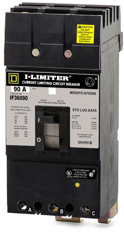 Square D I-limiter IF series three pole 90 ampere i-line style plug-on current limiting molded case circuit breaker with maximum voltage rating of 600V trip type thermal magnetic common trip and standard interrupting rating of 200 kiloampere at 480V (LI) Long-Time and Instantaneous trip functions.