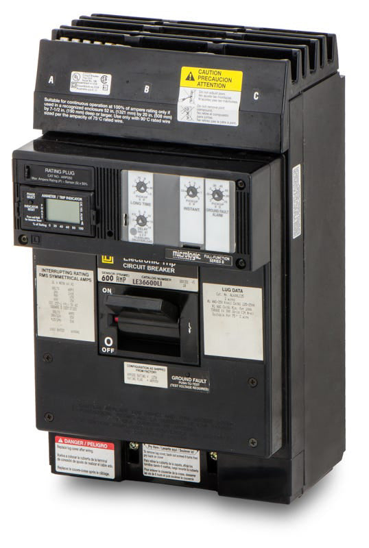 The Square D LE36600LI is a 3 Pole solid state molded case circuit breaker with a current rating of 600 Amps and a voltage rating of 600V. It has an interrupting rating of 65kA@480V. The LE36600LI has a I-Line style plug-in connection type and includes LI - long time and instantaneous functions.