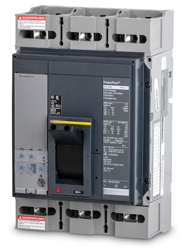 The New Square D PGL36060U33A PowerPact P-Frame Molded Case Circuit Breaker is a 3-pole, 3-phase circuit breaker built for high performance in order to protect your electrical system from short circuits and overloads. It has a max voltage of 600Vac and a rated current of 600A. Designed for unit mounting, this bolt-on circuit breaker is easy to install in any industrial setting. This UL Listed solid-state protected circuit breaker provides LSI - Long-Time, Short-Time and Instantaneous trip functions. It is complete with MicroLogic interchangeable standard 5.0 trip and has standard interrupting capacity. It comes with line & load side lug terminals. The P-Frame Square D PGL36060U33A has an AIC rating of 35kA@480V.