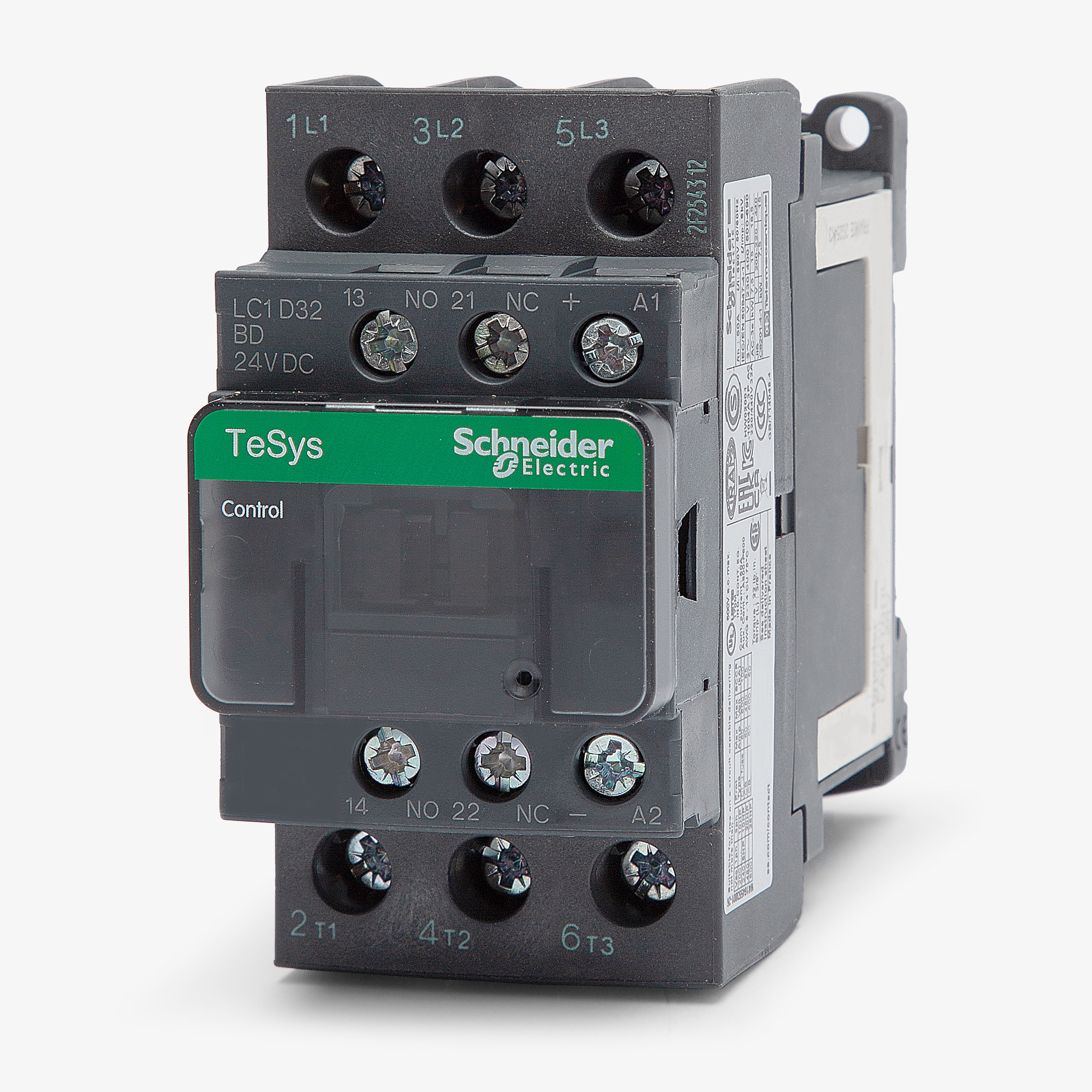 The Schneider Electric LC1D32BD is a 3 Pole contactor with a current rating of 32 Amps and a voltage rating of 690VAC, 300VDC. It has a coil volts of 24VDC at 50/60Hz. The LC1D32BD has a screw clamp terminal connection and it is used for LC1-D series motor control systems.