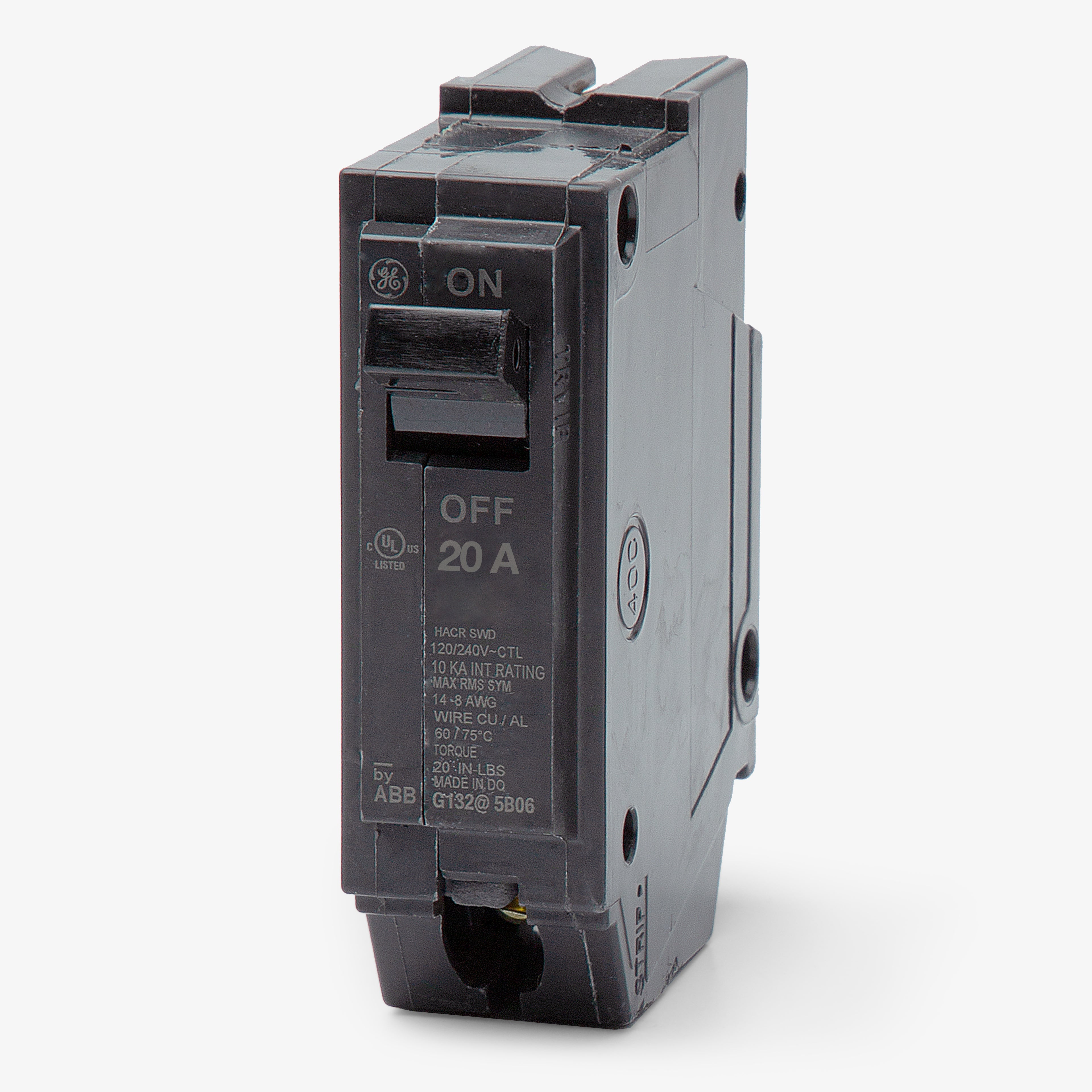 Designed for dependable branch circuit protection, the GE THQL1120 is a 1-pole, 20A miniature breaker. It utilizes thermal-magnetic technology to safeguard residential wiring from overloads. This unit installs into GE PowerMark Gold, ABB ReliaHome, and A-Series panelboards. The plug-on design ensures a secure connection without bolted hardware. Carrying a 10kAIC rating at 120/240VAC, this breaker features a quick-make, quick-break mechanism.