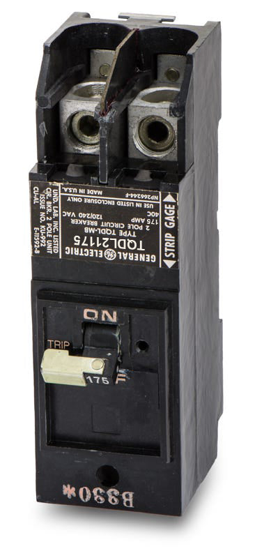 The General Electric TQDL21175 is a 2 Pole thermal magnetic molded case circuit breaker with a current rating of 175 Amps and a voltage rating of 120/240VAC. It has an interrupting rating of 10kAIC at 120V. The TQDL21175 has a plug-in connection type and includes long time and instantaneous trip functions.